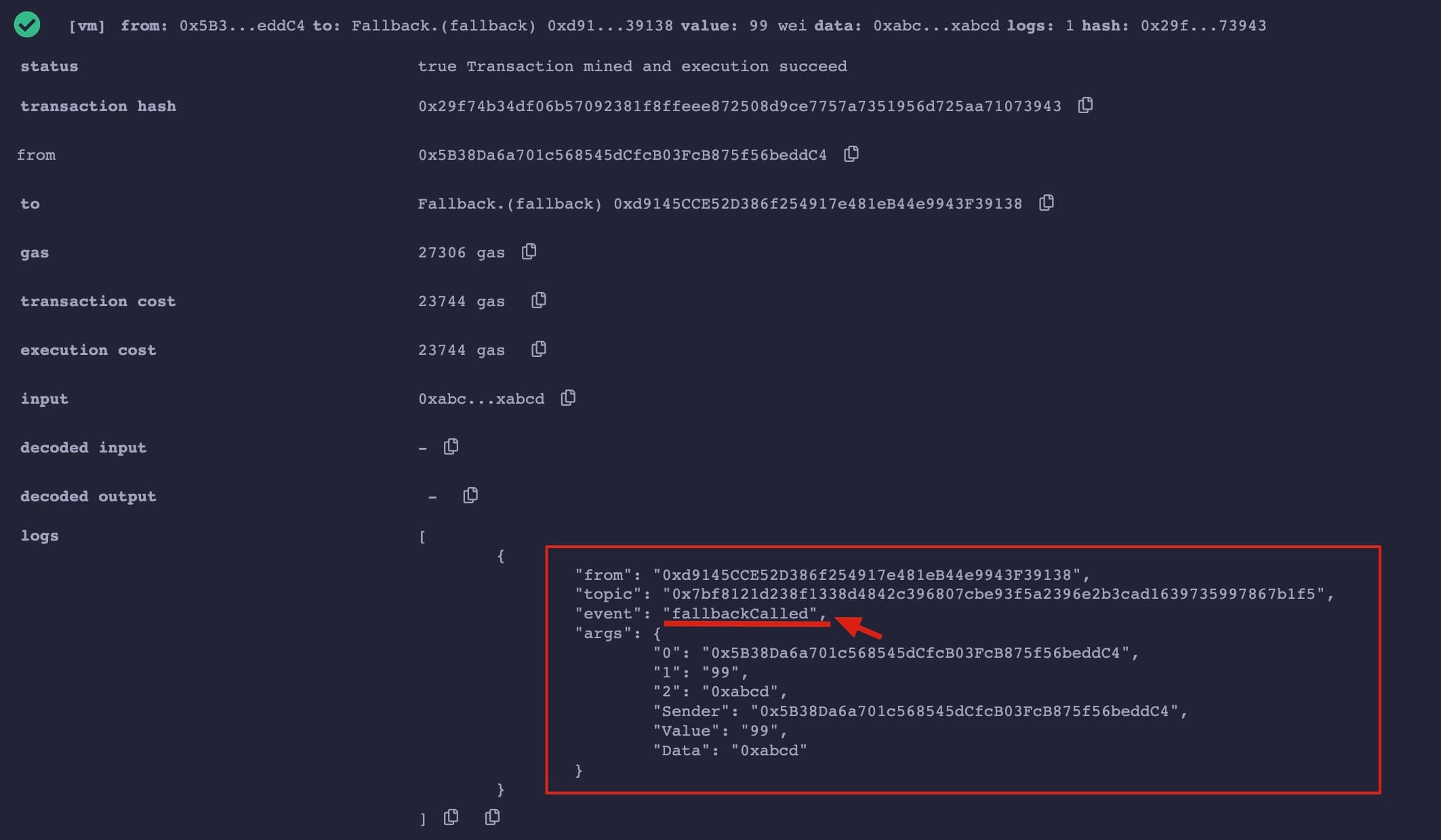 The transaction succeeded, and the "fallbackCalled" event emitted. "fallbackCalled".